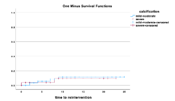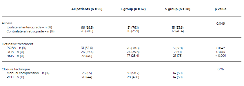 In terms of primary access, 46.4% (n = 12) of patients in the S group required contralateral retrograde access, which was significantly higher than the L group, where only 23.9% (n = 16) needed contralateral retrograde puncture (p = 0.049). Arterial calcification did not influence freedom from reinterventions, Figure 3. Relatively to the definitive treatment strategy, DEB was more frequently used in L group (p = 0.004) and bailout stenting in s group (p < 0.001). POBA was the definitive treatment modality in 17.9% (n = 5) patients in S group and 38.8% (n = 21) in L group (p = 0.47), while deb was used for 7.1% (n = 2) and 35.8% (n = 26) of the patients in S and L group, respectively (p = 0.004). 75% (n = 21) of the patients in s group and 25.4% (n = 17) in L group required bailout stenting (p < 0.001). closure technique did not differ significantly between the two groups (p = 0.76), with similar rates of manual compression and PCD use.
