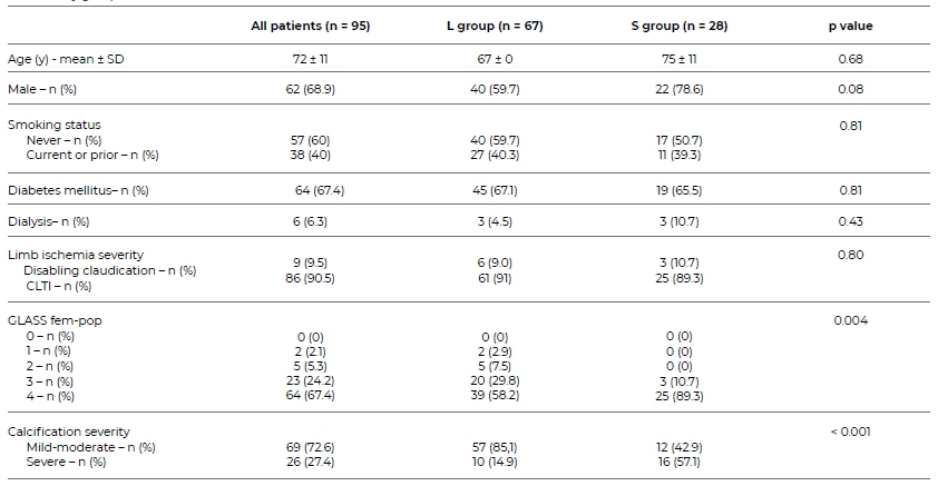 The study included 95 patients, of whom 10% (n = 9) presented with intermittent claudication, 25% (n = 24) with rest pain and 64% (n = 61) with ulcers or gangrene in the foot. The S group included 30% (n = 28) of the patients, and the L group included 70% (n = 67). The median follow-up time was nine months. Baseline characteristics are described in Table 2.