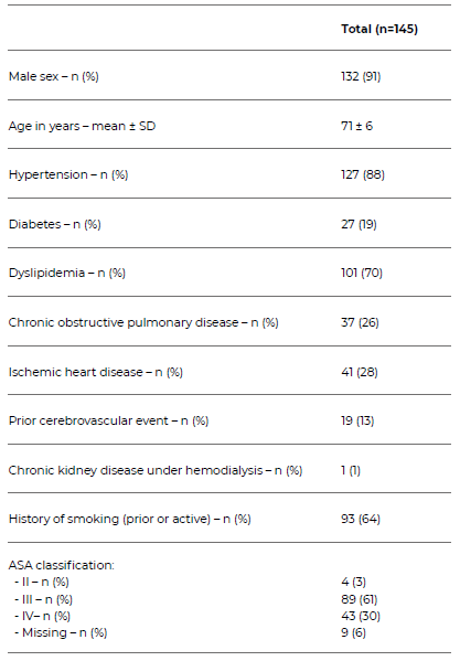 One hundred and forty-five patients were included in this study. Most patients were male (91%) with a mean age of 71 ± 6 years. The most common cardiovascular risk factors were hypertension (88%), dyslipidemia (70%) and ischemic heart disease (28%). Table 3 describes the patients’ demographics and characteristics.
