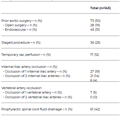 A staged procedure was performed in 21% of patients, and 12% had temporary sacral perfusion. Internal iliac artery occlusion was present in 27 (19%) and vertebral artery occlusion in 7 (5%) of patients. According to our SCI prevention protocol, a prophylactic CSFD was placed in 61 patients (42%).
