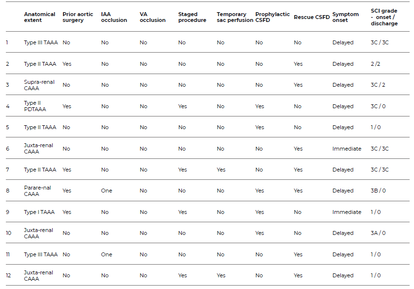 An individual analysis of all patients who developed SCI was performed and is represented in Table 7. Of the 12 patients, half presented with a TAAA, five with a CAAA and one with a post-dissection TAAA. All TAAA cases were Crawford types I-III. Most patients (83%, n = 10) presented with delayed SCI.