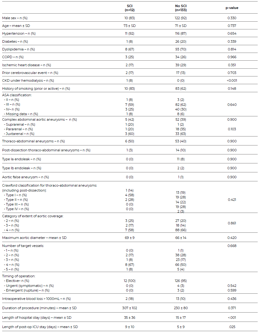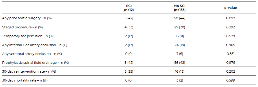 The primary endpoint was the occurrence of post-operative SCI. Secondary endpoints were 30-day reintervention and 30-day mortality rates. An additional analysis was performed comparing patients who developed SCI with those who did not.