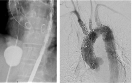 From a technical point of view, during the deployment of the main device, to ensure a very precise deployment, there are different blood pressure-lowering measures that can be employed which include rapid ventricular pacing or right atrial balloon inflow occlusion technique, the latter used in our case. The Munich Valsalva technique is another alternative which consists in closing the adjustable pressure-limiting valve to 25 mmHg during manual mechanical ventilation, creating "manual bloating" of the lungs and sustained apnea. The increased intrathoracic pressure causes compression of the vena cava and pulmonary veins, reducing the venous backflow and gradually decreasing the arterial pressure. Once the desired pressure is obtained, the stentgraft can be accurately deployed. The airway pressure is thereafter slowly reduced, and the patient is taken back to normal ventilation. The procedure is then finished following standard practice.10 Also the risk of cerebral embolization remains a limitation to the endovascular approach, there are several maneuvers to mitigate this risk, including flushing the device with CO2 and sequentially clamping the carotid arteries during catheter manipulations.
