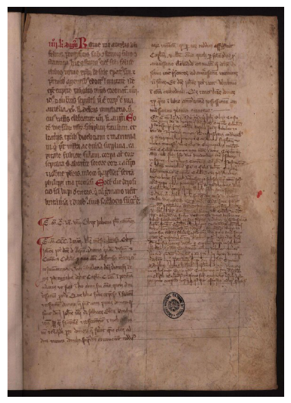 O manuscrito medieval, que mais nos interessa, tem sido datado dos séculos XIII ou XIV. É possível, porém, indicar um intervalo cronológico mais preciso para a sua elaboração: o livro terá sido escrito entre 28 de julho de 1322 ou 1326 e o mesmo dia de 1328. A primeira data é a do último registo de óbito copiado por aquela que pensamos ser a mão original8; a segunda corresponde à da mais antiga inscrição que apresenta outra grafia9, constando ambas das comemorações do dia 4 das calendas de agosto (fig. 1). A incerteza relativamente ao termo a quo prende-se com a forma como a data do registo está escrita: Era Mª CCCª LXIIIIª Kalendas mensis Agusti. O dia do mês é, forçosamente, 4 das calendas de agosto (correspondente, na contagem progressiva dos dias, a 28 de julho), porque a inscrição diz respeito a esse dia; pode-se interpretar como estando a data completa e as unidades corresponderem ao dia do mês, sendo, portanto, a Era hispânica de 1360 (1322 da Era cristã), ou que o ano inclui as unidades e se trata da Era de 1364, ou seja, 1326 da Era cristã, tendo o escriba, por lapso, esquecido a indicação do dia das calendas. Para complicar um pouco mais esta datação, acrescente-se que o registo em causa diz respeito a João Peres de Alporão, deão de Viseu e cónego de Coimbra, que outras informações indicam já não estar vivo em 131310, o que significa que nenhum dos anos indicados corresponderia ao da sua morte. Tal poderia acontecer quer por uma má leitura da data do obituário original, quer por erro cometido ao copiar. Em qualquer dos casos, para o que nos interessa, é possível apontar uma cronologia muito mais precisa para a redação desta versão do obituário, que terá assim ocorrido durante a década de 20 do século XIV.