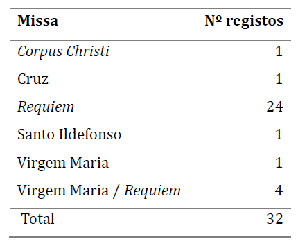 Dessas 32, a larguíssima maioria (24, correspondentes a 75% do total) determinava a celebração de uma missa de requiem. Num caso apenas, no aniversário do bispo D. Raimundo d’Ébrard (falecido em 1324), a missa seria a do Corpo de Deus21, num outro, por alma de um físico do rei D. Dinis, a missa da Cruz22. Noutra situação, pede-se a missa do santo do dia em que a comemoração era instituída, Santo Ildefonso23, e outra ainda prevê a missa dedicada à Virgem Maria24. Nos restantes quatro casos, os aniversários deviam começar a ser celebrados em vida dos seus instituidores: enquanto vivessem, a missa seria a de Santa Maria, e após morrerem a de requiem25.