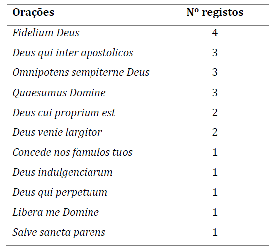 As orações solicitadas para estes aniversários fora da catedral eram as seguintes: Omnipotens sempiterne Deus, Deus qui nos patrem et matrem, Fidelium Deus, Quaesumus Domine, Inclina Domine. Regressemos ao Livro das Kalendas e aos aniversários do mês de janeiro, que nos têm servido de referência. O quadro n.º 2 indica as orações a rezar nos sete únicos casos em que, nesse mês, são discriminadas. Apenas duas das referidas não estão presentes: Deus qui nos patrem et matrem e Inclina Domine. As restantes constam entre as mais pedidas, a par de uma outra, Deus qui inter apostolicos. Todas pertencem ao ofício de defuntos, à exceção de Salve sancta parens e Concede nos famulos tuos, que são preces à Virgem, demonstrando a devoção por parte de quem as pedia a Santa Maria, padroeira da catedral de Coimbra e principal intercessora junto de Deus.