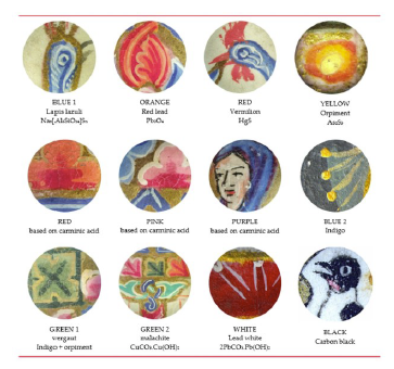 Fig. 9 The representative molecular palette for the four manuscripts. Details from MS LA 193, Gospel, seventeenth century (1647-1693), Crimea, as well as one, the black, from MS LA 216, Gospel, 1686, Isfahan (New Julfa).