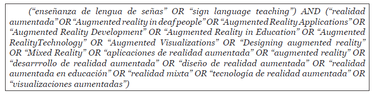 Basándonos en las preguntas de investigación definidas, se identificaron inicialmente dos términos clave principales, a saber, “realidad aumentada” y “lenguaje de señas”. Además, se consideraron posibles variaciones como sinónimos, texto en inglés y formas singulares/plurales, lo que resultó en la siguiente cadena de búsqueda (figura 1):