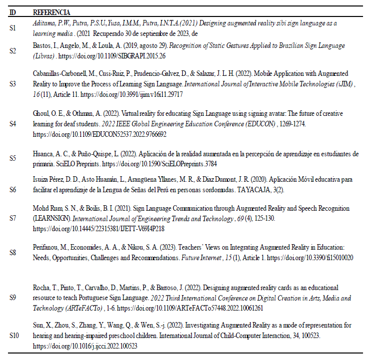 En la investigación en mención llevamos a cabo una revisión sistemática de artículos relacionados con el uso de la realidad aumentada en la enseñanza de la lengua de señas. Nuestro objetivo es resaltar estudios que exploren la utilización de herramientas y tecnologías de realidad aumentada para la enseñanza y el aprendizaje de la lengua de señas, así como los beneficios de su implementación en entornos educativos inclusivos para estudiantes sordos y los desafíos tecnológicos que se presentan.