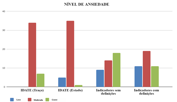 Figura 2: Nível de ansiedade apresentado pelos estudantes de enfermagem (N = 41) no IDATE (Traço e Estado); no RE “Nível de Ansiedade”, com indicadores sem definições; e no RE “Nível de Ansiedade”, com indicadores e suas definições, Rio de Janeiro-RJ, 2024