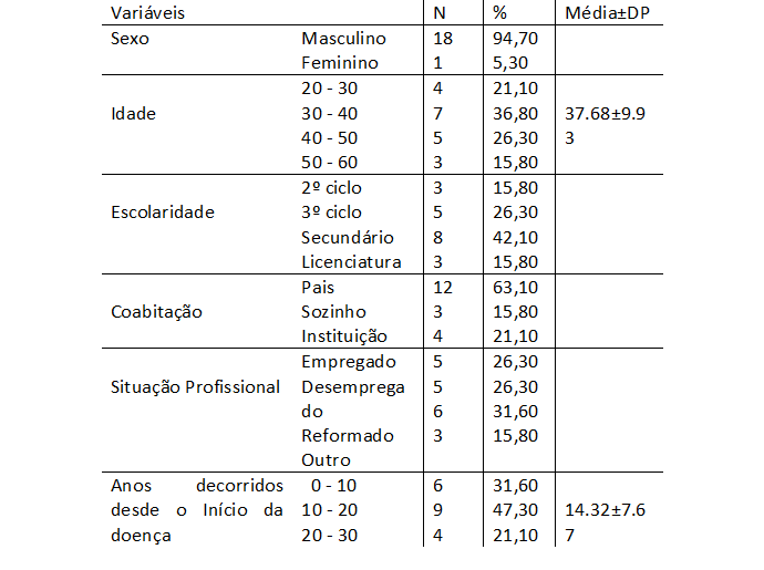 A amostra é constituída por 19 utentes, sendo 18 (94,70%) do sexo masculino. As idades variam entre 23 e 56 anos, com média de 37.68±9.93 anos. Verificou-se que a maioria tem o Ensino Secundário (42,10%), reside em meio urbano (42,10%) e com os pais (63,20%). Ao nível da situação profissional, 31,60% estão reformados por invalidez, 26,30% estão em situação de desemprego e igual percentagem desempenha uma atividade profissional. Relativamente ao número de anos decorridos desde o início da doença, obteve-se uma média a 14.32±7.67 anos, sendo o mínimo 3 e o máximo 32 anos.