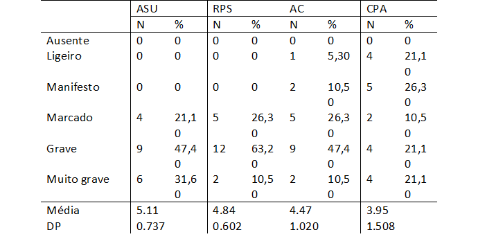 Relativamente ao funcionamento social e pessoal (tabela 2) verificou-se que no domínio ‘ASU’ as pontuações variam entre o grau de dificuldade “marcado” (4) e “muito grave” (6). A maioria dos participantes (47,40%) apresenta um grau de dificuldade “grave”, seguindo-se o grau “muito grave” com 31,60% e o grau “marcado” com 21,10% dos participantes. A média obtida é de 5.11±0.74 pontos. No domínio ‘RPS’, as pontuações variam também entre o grau de dificuldade “marcado” (4) e “muito grave” (6). O grau de dificuldade “grave” foi identificado em 63,20% dos participantes, seguindo-se o grau “marcado” (26,30%) e o “muito grave” com 10,50% dos participantes. Obteve-se uma pontuação média de 4.84±0.60 pontos. As pontuações obtidas no domínio ‘AC’ variaram entre o grau de dificuldade “ligeiro” (2) e “muito grave” (6). A maioria dos participantes apresenta o grau de dificuldade “grave” (47,40%) ou “marcado” (26,30%). Os restantes apresentam graus de dificuldade “manifesto” (10,50%); “muito grave” (10,50%); e “ligeiro” (5,30%) dos participantes. A pontuação média obtida foi de 4.47±1.02 pontos.