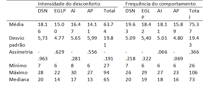 As médias obtidas para o total da componente e para as dimensões ‘AI’ e ‘DSN’ são inferiores aos valores da mediana. Estes dados conjugados com a análise dos valores da assimetria, indicam uma tendência para os participantes pontuarem nos níveis mais elevados da medida, apontando para níveis de desconforto importantes nos comportamentos interpessoais.