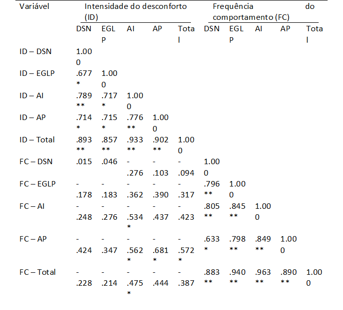 Relativamente às dimensões, verificou-se também a existência de correlações negativas entre as dimensões e o total da componente ‘intensidade do desconforto’ e as dimensões e o total da componente ‘frequência do comportamento’, por outro lado, as correlações entre as componentes e as suas dimensões são, na sua totalidade, moderadas a fortes, positivas e com significado estatístico (p< 0,05).