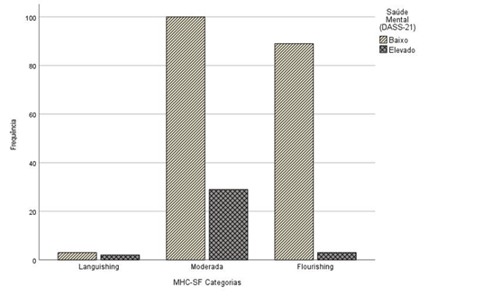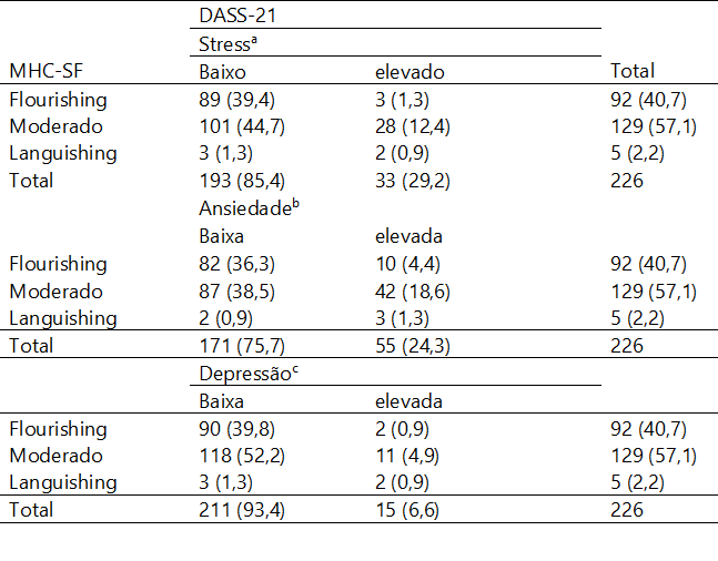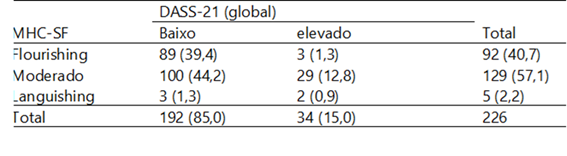 Pode-se ainda observar (Tabela 2) que 1,3% dos jovens apresentam-se em flourishing e apresentam sintomas elevados de sofrimento psicológico, do mesmo modo que 1,3% apresentam languishing e simultaneamente estão com nível de sintomas global considerado baixo.