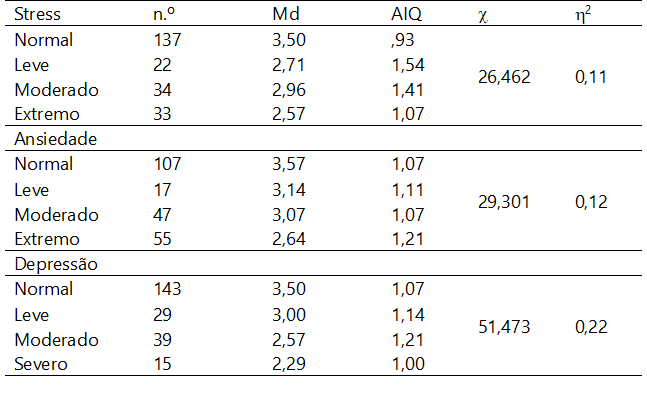 Tabela 3 Resultados da aplicação do teste H de Kruskal-Wallis aos scores globais da MHC em função dos níveis de ansiedade, depressão e stress medidos pela DASS-21 (N=226)