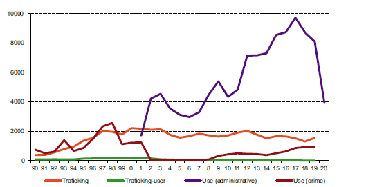 Similar to what was described earlier regarding access to illegal drugs, the Supreme Court of Justice’s Judgment specifically impacted PWUD and clashed with practices associated with drug use that arise precisely from the illegal nature of the activity. It is well-known that PWUD face challenges in acquiring drugs, which can lead them to purchase larger quantities for financial advantages such as lower prices and longer-lasting supply, minimising their exposure to transactions (Cruz, 2014). These practices primarily serve personal use and not business purposes. According to Cruz (2014), involvement in criminal activities is extremely rare among non-dependent users, except in situations where the possession of larger quantities of drugs is considered a crime. The outcome of the Supreme Court ruling was doubly paradoxical. Over the past two decades, contrary to the European and global trends of reducing sanctions for drug consumption, the country has experienced an increase in punitive measures, encompassing both criminal and administrative actions targeting PWUD. However, the paradox is twofold because, during the same period, a decrease in punitive measures directed towards drug dealers has also been observed. The following sections delve deeper into these trends (sections 2 and 3).