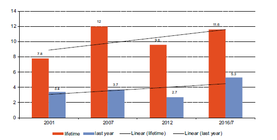 Aggregate studies (Greenwald, 2009; Hughes & Stevens, 2010, 2012; Kury et al., 2019; Quintas, 2006, 2011; Quintas & Arana, 2017) show that the decriminalisation of drug use in Portugal did not lead to significant increases in drug consumption. Additionally, it coincided with a reduction in dependent drug use and related harms2. A general population survey (15 to 64 years old) on drug use was conducted in Portugal in 2001, 2007, 2012, and 2016-17 by Balsa et al. (2003, 2008, 2013, 2017). These surveys indicate that the lifetime prevalence rates for all illegal drugs were 7.8% in 2001, increased to 12.0% in 2007, and then declined to 9.6% in 2012. The most recent data shows a further increase to 11.6% in 2016-17. The prevalence rate for the past year has also been relatively stable, albeit with an upward trend (see Figure 2). In comparison, Portugal remains a country with a relatively low prevalence of drug use in the general population (e.g., European Monitoring Centre for Drugs and Drug Addiction [EMCDDA], 2023 - Portugal ranks 23rd out of 29 countries in terms of lifetime prevalence rates for cannabis use).