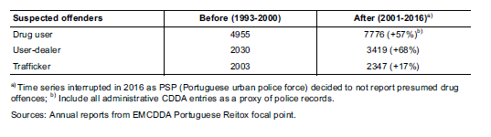 a) Time series interrupted in 2016 as PSP (Portuguese urban police force) decided to not report presumed drug offences; b) Include all administrative CDDA entries as a proxy of police records.