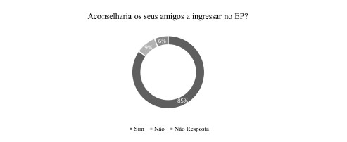 Quando questionados se aconselhariam os seus amigos a ingressar no Exército, os resultados obtidos foram bastante encorajadores. De acordo com a Figura 3, 85% dos inquiridos consideram o EP uma organização suficientemente capaz, ao ponto de aconselharem os amigos a ingressar como um caminho futuro. O facto de os inquiridos assumirem esta posição revela não só o reconhecimento da marca Exército, mas também que funcionam como agentes de promoção da mesma.