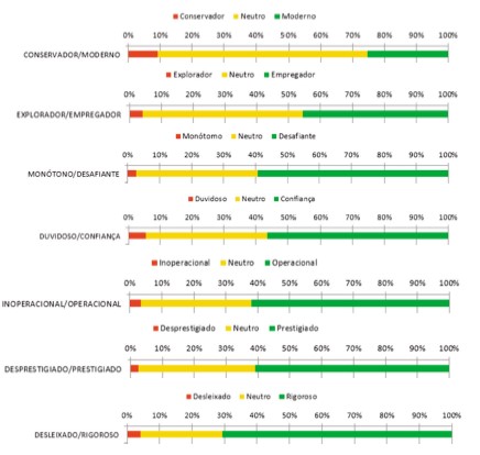 Outro fator que a Figura 5 nos permite destacar, é o posicionamento neutro da amostra face às áreas de estudo. Com um posicionamento entre os <70% (Conservador/Moderno) e os >25% (Desleixado/Rigoroso), poderá expor não só o desconhecimento da brand EP, como também as capacidades do EP como promotor de atração de RH.
