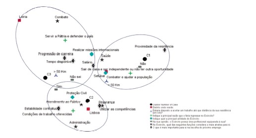 Com base nas respostas ao inquérito e considerando a H3, foi realizada uma Análise de Correspondências Múltiplas, tendo sido identificados 3 Clusters (C) distintos, conforme representado na Figura 6. No C1, encontram-se representados os indivíduos residentes na cidade de Setúbal, que consideram, para a escolha do próximo emprego, a proximidade da zona de residência. Estes indivíduos assumem a saúde como a função mais atrativa do Exército, e a principal razão que os levaria a ingressar no Exército seria a possibilidade de sair de casa, ser independente ou não terem outra oportunidade. De acordo com a opinião destes inquiridos, a principal utilidade do Exército é combater e ajudar a população. Os indivíduos aqui identificados priorizam trabalhar perto de casa e não estão dispostos a deslocar-se longas distâncias para trabalhar no Exército. A proximidade à residência surge como um fator decisivo para a escolha deste grupo de jovens, indicando uma relação com a estabilidade local e familiar, o que pode indicar uma vida comunitária forte e próxima entre os indivíduos da região de Setúbal.