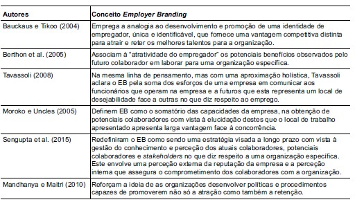A concetualização do EB nasceu da necessidade de identificar os fatores associados às capacidades inerentes de uma organização para contratar potenciais colaboradores em relação a outra organização (Barrow & Mosley, 2005; Sokro, 2012). Essencialmente focado nos benefícios psicológicos, económicos e funcionais, o EB foi assumido como um elemento-chave no catapultar da imagem de uma organização como boa empregadora e um excelente local de trabalho (Barrow & Mosley, 2005). O EB retrata um conceito que deriva da necessidade das empresas de criarem vantagens competitivas (Barney, 1991), tendo vindo a assumir, de forma progressiva, uma importância determinante no capítulo da atratividade. Desde então, o conceito tem sido definido por vários autores, dos quais se destacam os presentes na Tabela 1.