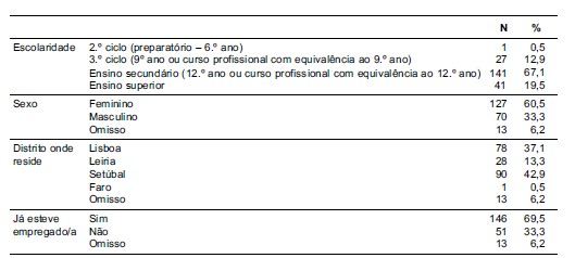 A maior parte dos indivíduos residia em Setúbal (42,9%), seguida por Lisboa (37,1%), e Leiria (13,3%), com uma pequena fração de Faro (0,5%). A maioria dos participantes era do género feminino (60,5%) em contraste com os 33,3% do género masculino. Relativamente à escolaridade, importa referir que grande parte dos inquiridos tem o ensino secundário (67,1%), seguido pelo ensino superior (19,5%), 3.º ciclo (12,9%) e 2.º ciclo (0,5%).