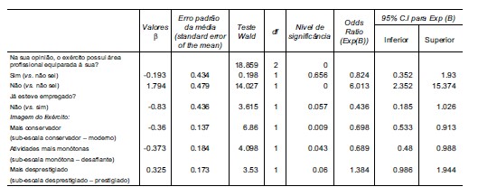 Em relação à hipótese levantada, foi efetuada uma regressão logística cujo objetivo foi verificar os efeitos das variáveis seguintes na probabilidade (likelihood) de rejeitar a oferta de emprego do EP: 1) O Exército possui uma área profissional equiparada à sua? 2) Comparativamente a outros empregos, o Exército oferece (melhores condições, nem melhores nem piores, ou piores condições)? 3) Já esteve empregado antes? e 4) as 7 escalas do questionário sobre a imagem que os participantes têm do EP.