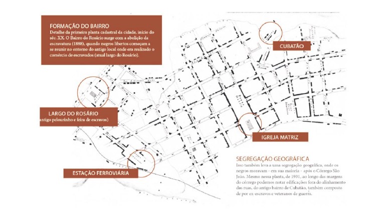 Como exemplo do referido abandono, pode-se ver no mapa (Figura 1), que ainda permanecia, no ano de 1901, uma segregação geográfica, pois a população negra habitava em bairros específicos, como o bairro de Cubatão, longe das pessoas brancas.