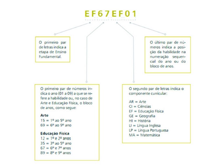 A Figura 3 mostra a BNCC com suas respectivas unidades temáticas, objetos de conhecimento e habilidades definidas para cada ano (ou bloco de anos). Mostra também que as habilidades são identificadas por códigos alfanuméricos. Por exemplo, o código EF67EF01 está relacionado com a habilidade proposta na disciplina de Educação Física no bloco referente aos 6º. e 7º. Anos do Ensino Fundamental. Sendo assim, pode-se depreender com clareza que:
