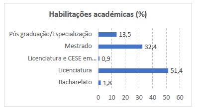 A maioria dos participantes (51,4%) possui uma licenciatura e cerca de 32% dos educadores possui um mestrado. A habilitação académica menos representada nesta amostra é a licenciatura com CESE (figura 1).