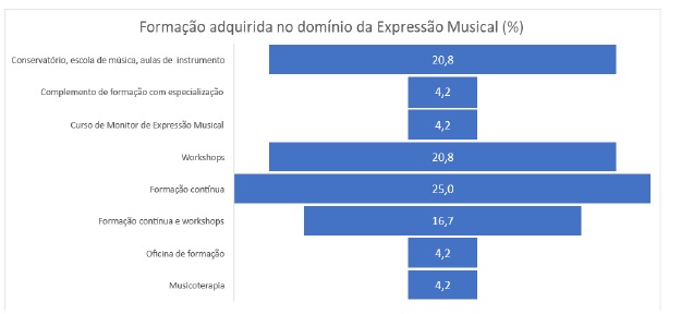 No que concerne às respostas dos educadores relativas à sua formação musical, verificamos que, da totalidade dos respondentes, a grande maioria (78,4%) referiu não ter formação musical para além da obtida no seu curso superior de formação de professores. O facto de nenhum profissional assinalar a formação musical obtida no ciclo preparatório revela como esta, pela sua curta duração, é facilmente esquecida. Ainda no que respeita à formação musical previamente obtida, esta realidade difere da de alguns países em que uma quantidade significativa de futuros educadores obtêm alguma formação musical antes de ingressarem nos seus cursos superiores. É o que acontece em Inglaterra ou nos Estados Unidos em que os estudantes entram nos seus cursos de formação já com alguma experiência musical realizada por sua iniciativa (Hash, 2010; Henley, 2017; Pietra, 2010; Vannatta-Hall, 2010).