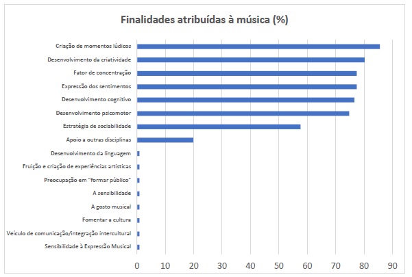Relativamente à finalidade que é atribuída à música quando realizam as atividades musicais, deu-se a possibilidade de os respondentes escolherem mais do que uma opção. Dada a variedade abrangente de combinações de resposta obtidas, optámos por apresentar as percentagens dos respondentes que selecionaram cada uma das opções (figura 3).