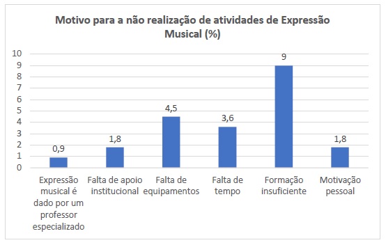 Apesar de 100% dos educadores terem reportado que têm por hábito recorrer a atividades de expressão musical na sua prática educativa, à pergunta que pretendia apurar as razões para a sua possível não realização, 9% dos respondentes alegou não ter formação suficiente para o fazer (figura 4).