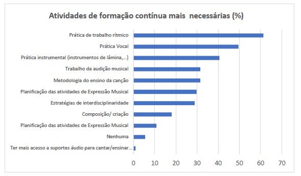 À questão sobre a necessidade de mais formação para realizarem atividades de expressão musical, 79,3% dos educadores responderam afirmativamente. Estas respostas confirmam a formação insuficiente ocorrida durante todo o seu percurso académico.