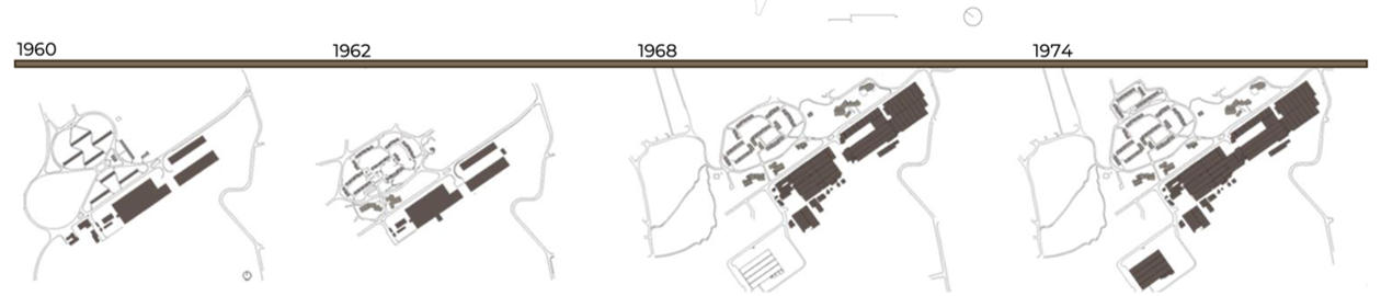 Figura 1 Implantação da Fábrica da Tabaqueira, habitação e equipamentos, nos planos de 1960 a 1974