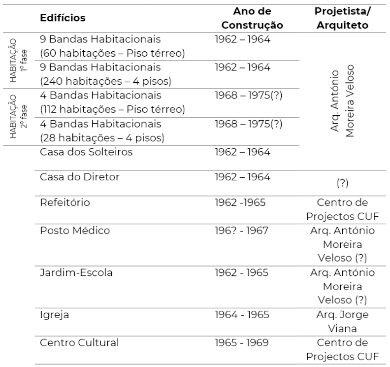 No ano de 1964 são oficialmente inauguradas 240 habitações (Tabela 2), embora algumas já tivessem sido ocupadas pelos funcionários da fábrica, em 1963. As habitações dividiam-se por 30 blocos habitacionais que estavam inseridos em 9 bandas. Os blocos foram projetados com 2 apartamentos por piso e com uma altura máxima de 4 pisos por edifício. Estes, só poderiam ser arrendados por funcionários que tivessem família, conforme as normas definidas pelo Estado, visto que estas habitações pertenciam às HE-FCP.