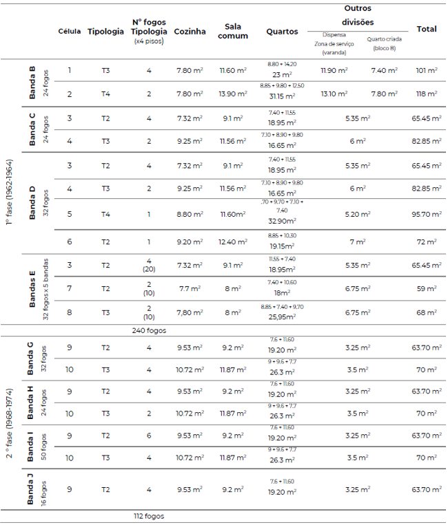 Por sua vez, a segunda fase do plano do bairro operário cria mais 112 fogos (Tabela 3), distribuídos em 4 bandas habitacionais, que se articulam em 14 blocos habitacionais e diferenciam-se em duas tipologias: i) T2 (72 fogos) que formam apenas uma célula (C9); ii) T3 (40 fogos) que apenas se conjuga em uma célula (C10); estimando-se que o bairro novo poderia ter cerca de 380 habitantes.