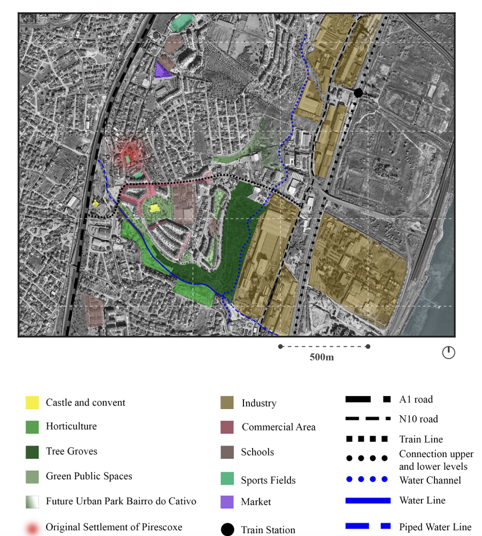 The modern rural and industrial identity of Pirescoxe’s spatial structure is intrinsically linked to the memory of demographical change brought on by labour dynamics. In the second half of the century, industrial development brought in a new population, often coming from far away for seasonal agricultural labour and settling into very poor accommodation in places they had no emotional links with (Salgueiro, 1977; Marat-Mendes et al., 2021).