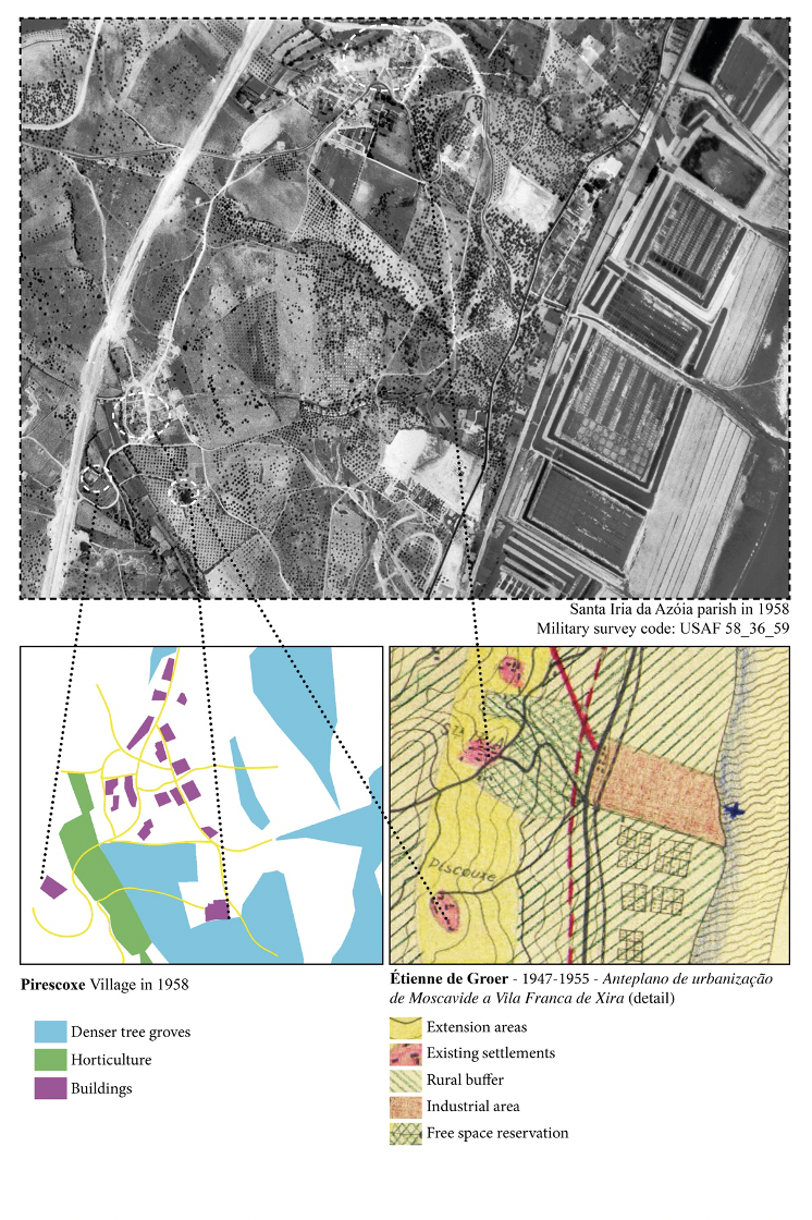 Anticipating this type of demographical change (prior to its confirmation) Gröer’s 1947 Foreplan established the infrastructure of the territory, setting a large urbanization area merging the villages of Pirescoxe and Via Rara to Santa Iria da Azóia into a larger town, with a surrounding rural buffer and a large industrial estate on the waterfront. But the territory told a different story from the start, since the first modern spatial structure actually stemmed from the factory and not around the existing urban core.