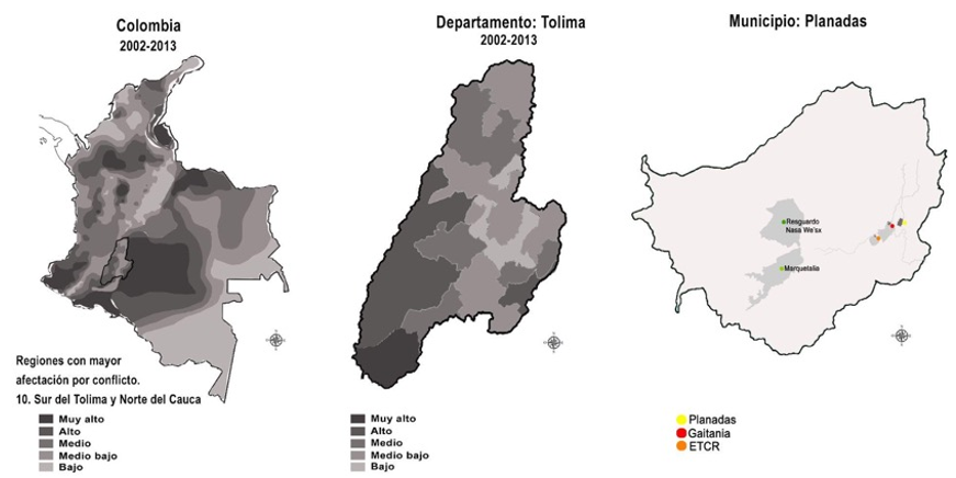 Gaitania es un centro poblado ubicado al sur del departamento, bajo la jurisdicción de Planadas, municipio que según datos del DPN (Departamento Nacional de Planeación, 2016) para los años 2002-2013 se encontraba dentro de los 81 municipios a nivel nacional, categorizados por incidencia del conflicto armado “muy alto”, siendo el único en el Tolima dentro de este grupo (Figura 1).