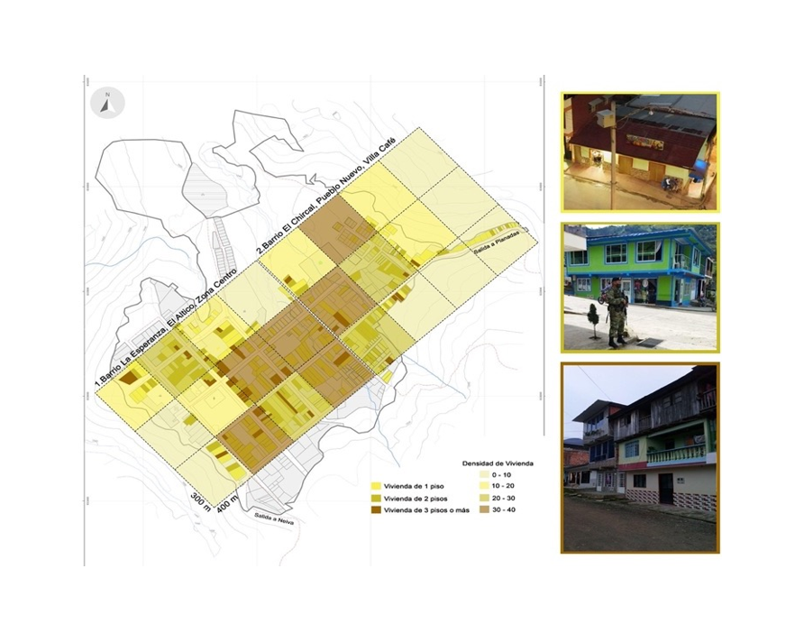 De otro lado, según los resultados obtenidos al calcular la densidad de viviendas a través de la cuadrícula de 100*100 (Agencia de Ecología Urbana de Barcelona, 2008), se identificó que los barrios con mayor densidad de vivienda son El Altico, La Esperanza y el barrio Centro (Figura 9). Estos barrios presentan una densidad entre las 20 a 30 y 30 a 40 viviendas por hectárea. Por otro lado, los barrios más alejados de la vía principal, como, Villa Café, El Chircal y Pueblo Nuevo, tiene una densidad de 0 a 10 y 10 a 20 viviendas por hectárea. Esto revela que los barrios cercanos a la vía principal, que es el eje comercial del corregimiento, presentan una densidad de vivienda más alta. Según el PBOT del año 2021, el modelo de ocupación urbana busca mantener una densidad baja con un promedio de 17 viviendas por hectárea, según este dato, se puede concluir que ha existido un proceso de densificación dentro del corregimiento.