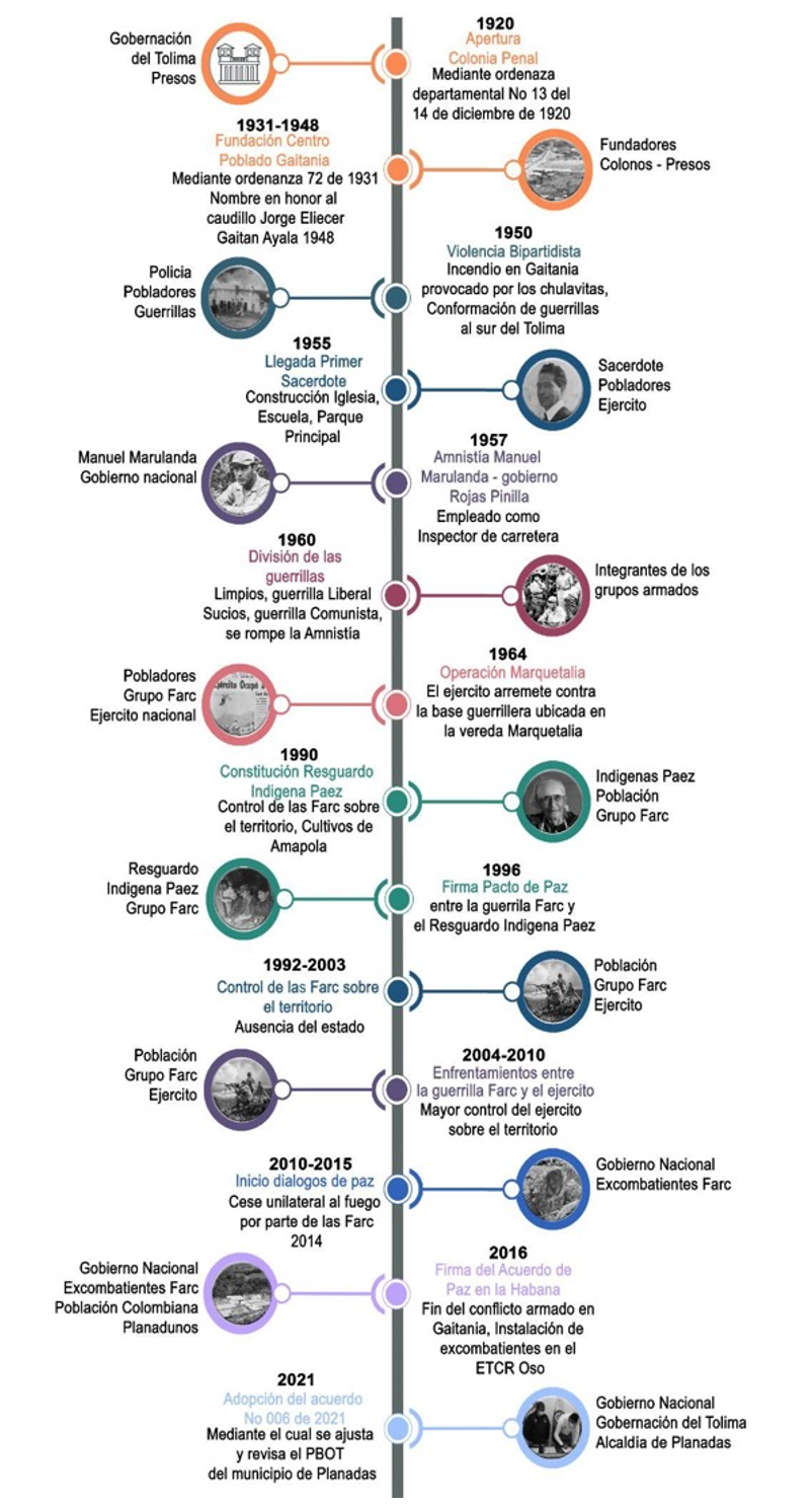 Desde su fundación como colonia penal agrícola en el año 1920 mediante el decreto 1018, este territorio se ha visto afectado por el conflicto armado y distintos hechos relacionados, que han hecho de Gaitania una pieza clave en la historia del conflicto armado del país, dentro de los que se destacan (Figura 2): en primer lugar, el incendio provocado por la “chulavita” (policía paramilitar) en 1950, entre este mismo año y hasta 1960 la conformación y reagrupación de grupos armados al sur del departamento, con la ubicación de la guerrilla comunista en Gaitania, liderada por Pedro Antonio Marín, alias Manuel Marulanda (Revelo & García, 2018). En 1964 se da la orden de iniciar la Operación Militar Marquetalia, que sería el mito fundacional de las FARC (Primera voz, 2022).