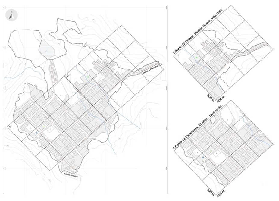 Partiendo de esta metodología, se localizaron dos mallas a lo largo del corregimiento, de las cuales se tomaron los datos necesarios para el análisis, con la ayuda de insumos como la consulta catastral en el portal del Instituto Geográfico Agustín Codazzi (IGAC) y la cartografía base del PBOT de Planadas. Para poder realizar una mejor caracterización de las zonas delimitadas, fue necesario apoyarnos en la verificación y obtención de datos en campo.