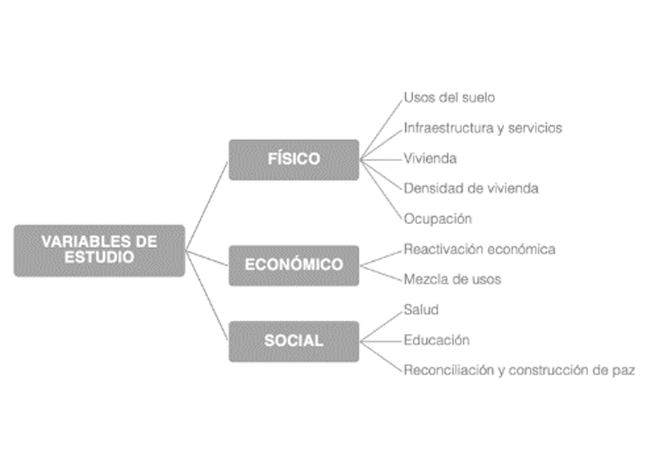El análisis físico se realizó considerando: 1) el uso del suelo; 2) la infraestructura y servicios; 3) la vivienda; 4) la densidad de vivienda, que hace referencia al número de viviendas en un área determinada (Zapatero, 2017); y 5) la ocupación, relación entre el espacio construido y no construido (Zapatero, 2017, p. 35). Por otro lado, el análisis económico se basa en: 6) la reactivación económica; y 7) la mezcla de usos, que implica la coexistencia de tres o más tipos de usos en un mismo ambiente para vivir, trabajar, vender, entre otros (Huatuco, 2021). Finalmente, el análisis social se realiza teniendo en cuenta: 8) la salud; 9) la educación; y 10) la reconciliación y construcción de paz.