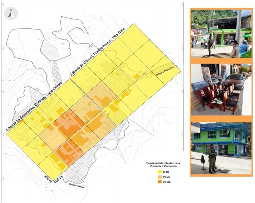 Estos hallazgos reflejan un aumento en el comercio dentro del corregimiento, ya que, si se comparan los números, en la actualidad entre las zonas 1 y 2, existen 159 viviendas con uso mixto, mientras que, en el año 2004, de la totalidad de viviendas del corregimiento, solo 74 tenían un uso mixto. Al observar la zonificación por densidad (Figura 8), se puede apreciar que en el barrio Centro existe dos recuadros que cuentan con 20 a 30 viviendas con uso mixto, localizadas en torno al parque y a la vía principal, sobre esta misma vía se encuentran 5 recuadros más, ubicados entre el barrio Centro y el barrio El Altico, con una densidad de 20 a 10 viviendas con uso mixto, mientras que los barrios El Chircal, Pueblo Nuevo, Villa Café y la Esperanza, tienen densidades de 0 a 10 viviendas con uso mixto, por cuadrícula.