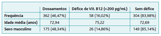 A amostra de 779 pessoas foi composta por 367 homens (47,11%) e 412 mulheres (52,89%). A idade média da amostra foi de 72,16 anos. Como exposto na Tabela 1, ao longo de 20 meses foram solicitados doseamentos de vitamina B12 a 362 pessoas, correspondendo a 46,47% de todos os diabéticos sob metformina. Destes, 58 (16,02%) apresentaram défice. A população que apresentou défice foi composta por 26 homens (44,83%) e 32 mulheres (55,17%) e a idade média foi de 75,22 anos.