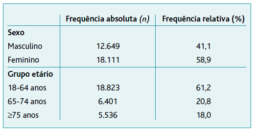 Na população do estudo foi verificado um ligeiro predomínio do sexo feminino (n=18.111, 58,9% vs n=12.649, 41,1%) e uma média de idades de 58,1 anos (mínimo 18 anos e máximo 105 anos). O grupo etário dos 18-64 anos foi o que apresentou maior número de indivíduos (61,2%). A média de idades da população do sexo feminino foi de 57,4 anos e do sexo masculino de 59,1 anos. A distribuição dos participantes em relação ao sexo e ao grupo etário consta da Tabela 1.