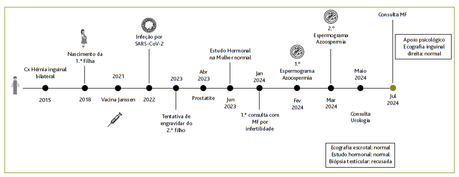 Em novembro/2022, o casal inicia estudo pré-concecional com o intuito de uma segunda gravidez. Perfazendo seis meses de tentativas de conceção sem sucesso, a esposa do doente, na altura com 38 anos, recorre a uma consulta de ginecologia privada, em junho/2023, onde lhe terá sido aconselhada a realização de uma histerossalpingografia. Perante a natureza invasiva do exame, o casal decide não avançar com o procedimento e o utente recorre então à consulta com a sua médica de família (MF), em janeiro/2024, com o intuito de fazer estudo de infertilidade masculina. Nesta consulta é-lhe prescrito um espermograma, que teve como resultado a ausência total de espermatozoides e de células imaturas. Pela surpresa do resultado, o utente opta pela realização de uma contra-análise em março/2024 numa clínica especializada, confirmando-se o resultado inicial de azoospermia. Perante os resultados, a médica de família opta por direcionar o utente para uma consulta de urologia. Nesta consulta, em maio/2024, o urologista pede investigação de possíveis causas de azoospermia com ecografia escrotal e estudo de hormonas hipofisárias e tiroideias, que se revelaram estar dentro da normalidade. Face aos resultados, foi recomendada a realização de biópsia testicular, que terá sido recusada pelo utente (Figura 1).